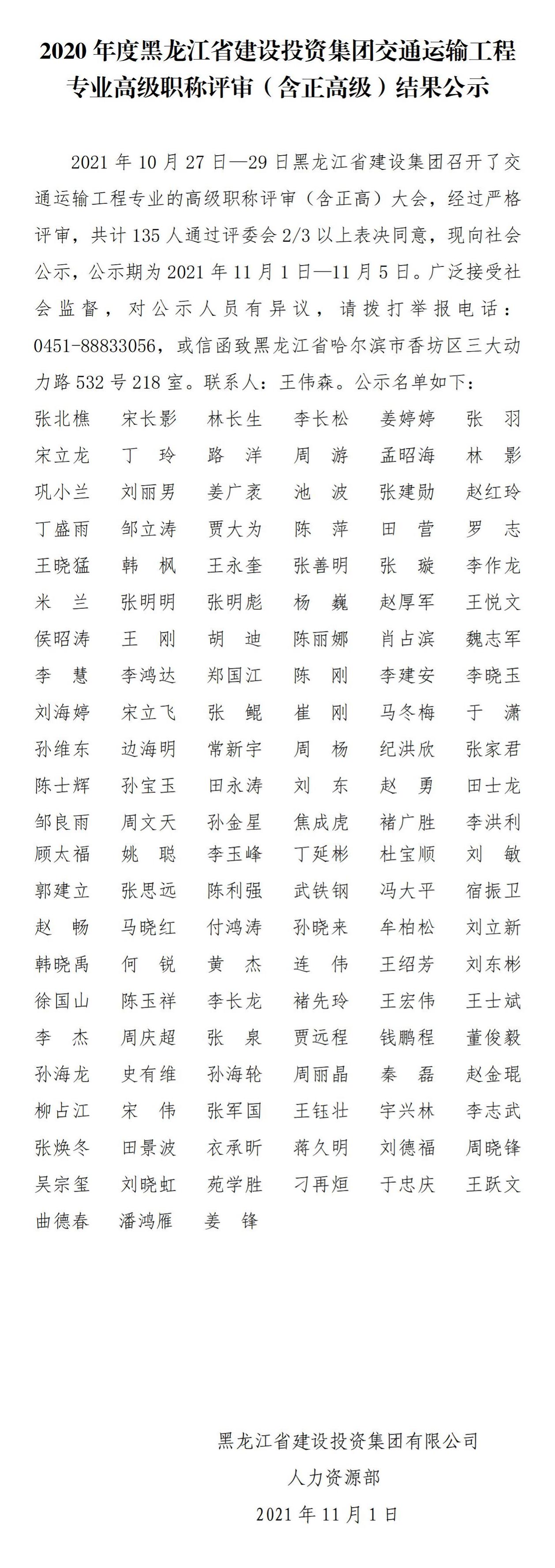 2020年度黑龍江省建設投資集團交通運輸工程專業高級職稱評審(含正高級)結果公示